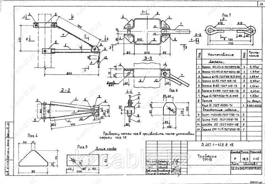 Траверсы ТМ-15 (проект 3.407.1-143.8.15) применяются в период монтажа анкерных промежуточных опор высоковольтных (10 кВ) воздушных линий для крепления определенного провода к стойкам типа СВ110 и СВ105. Крепление производится с использованием специальных хомутов: Х-1 (стойка СВ105) и Х-42 (стойка СВ110). Заказывать хомуты Х-1 и Х-42 необходимо отдельно.