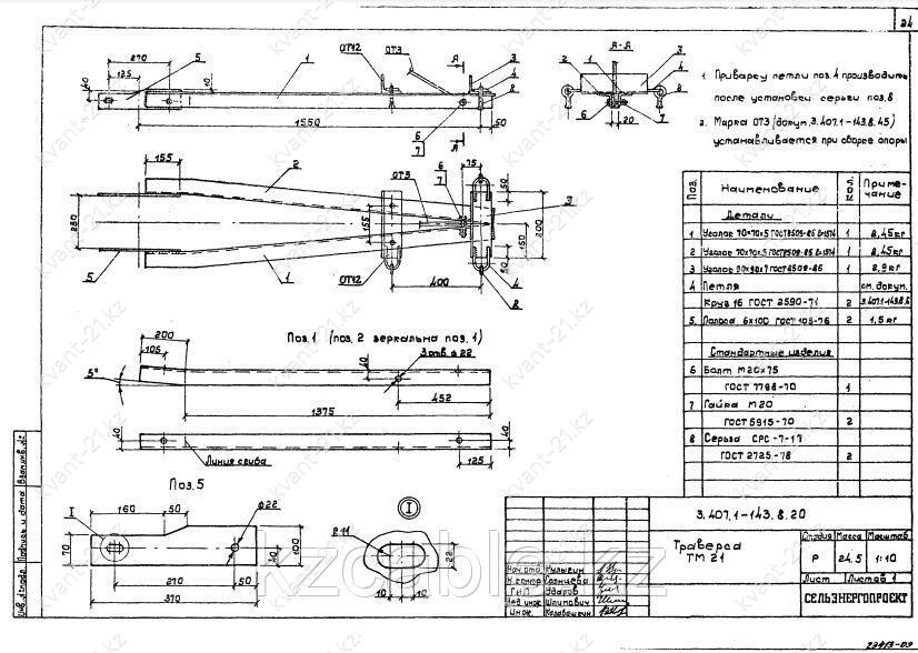Траверсы ТМ-21 (проект 3.407.1-143.8.20) служат для крепления проводов при установке промежуточных опор и прокладке высоковольтной линии электропередачи 10 кВ. Крепление траверсы осуществляется к стойке СВ105 с использованием хомута Х-1, а к стойке СВ110 с использованием хомута Х-42. Поставка хомутов производится в отдельно.