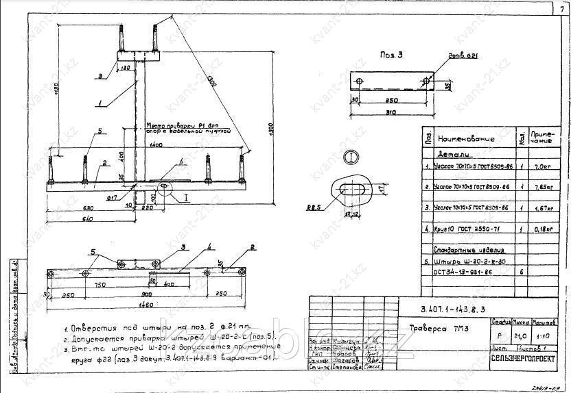 Траверса ТМ-3 изготавливается по типовому проекту 3.407.1-143.8.3 из углеродистой стали, имеет лаковое (лак БТ-577) антикоррозийное покрытие. Для присоединения изоляторов ШФ20-В, ШС10-Д, ШФ10-Г на траверсе ТМ-3 имеются штыри. Крепление штыревых изоляторов к траверсе ТМ-3 выполняется колпачками таких типов: КП-22, К-6, К-7,К-9. Крепление провода к изоляторам осуществляется либо спиральной (ПВС) вязкой либо проволочной (ВШ-1).